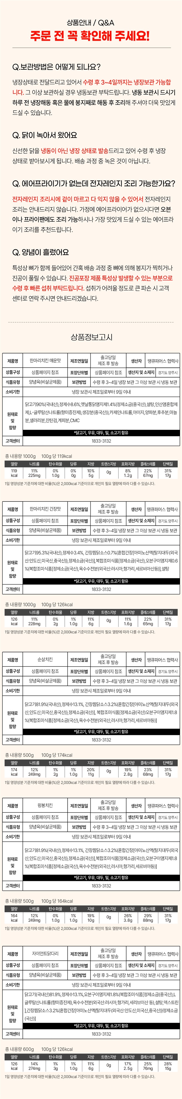 | 7. 상품구성 | 한마리치킨(간장맛, 매운맛) 1kg 1봉 / 순살, 윙봉 500g 1봉 / 자이언트닭다리 600g 1봉 |