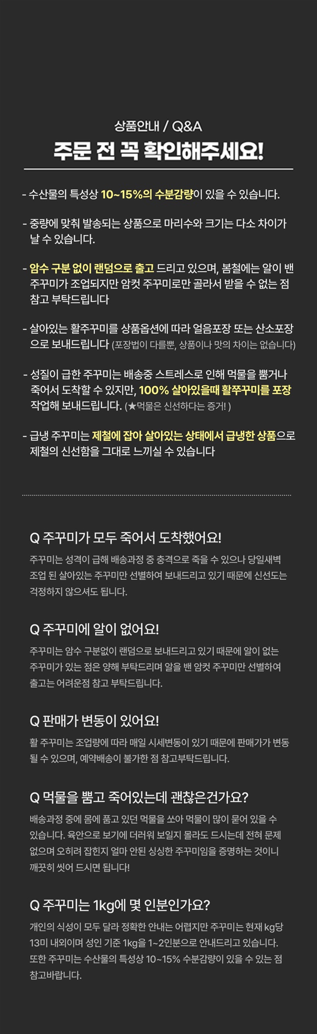 | 9. 소비자 안전을 위한 주의사항 (「식품 등의 표시ㆍ광고에 관한 법률 시행규칙」 제5조 및 [별표 2]에 따른 표시사항을 말함) | 깨끗이 세척하여 드시기 바랍니다. 수산물 특성상 가급적 수령 후 빠른 섭취를 권장 |