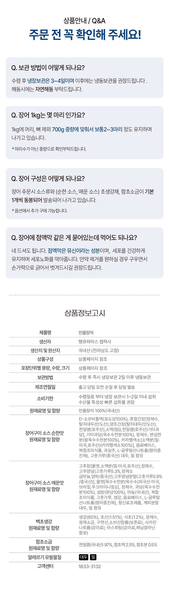 5. 제조연월일, 소비기한 또는 품질유지기한 | 당일 손질 및 초벌 후 당일 발송, 수령일로부터 2일이내 섭취 |