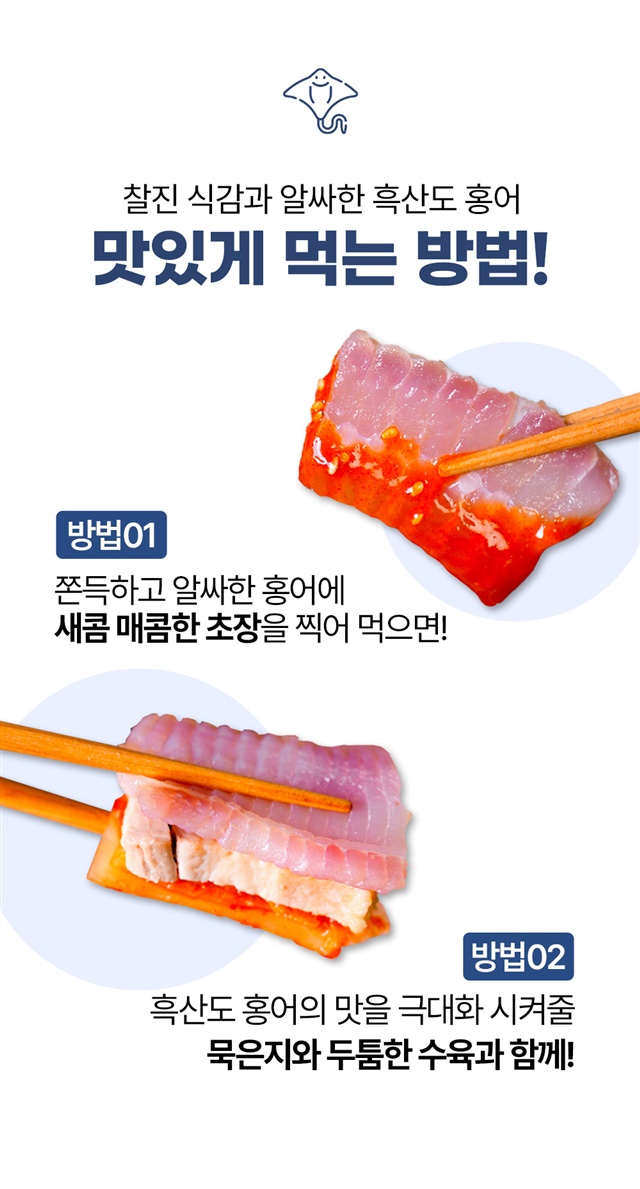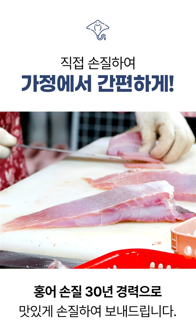 | 8. 보관방법 또는 취급방법 | 수령 후 냉장 보관, 스킨을 벗기지 않은 상태에서 냉장 보관 시 10~15일 보관 가능합니다. 홍어 특성상 보관 기간에 따라 숙성이 더 진행될 수 있습니다. |