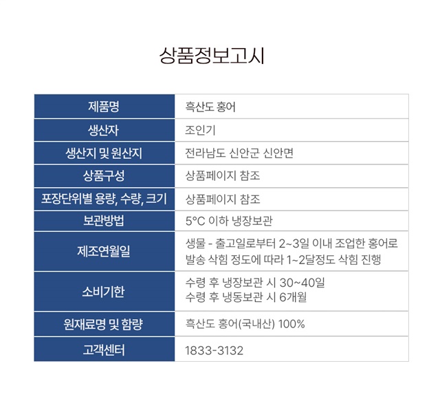| 4. 「농수산물의 원산지 표시 등에 관한 법률」에 따른 원산지 | 국산(전라남도 신안군 흑산도) |