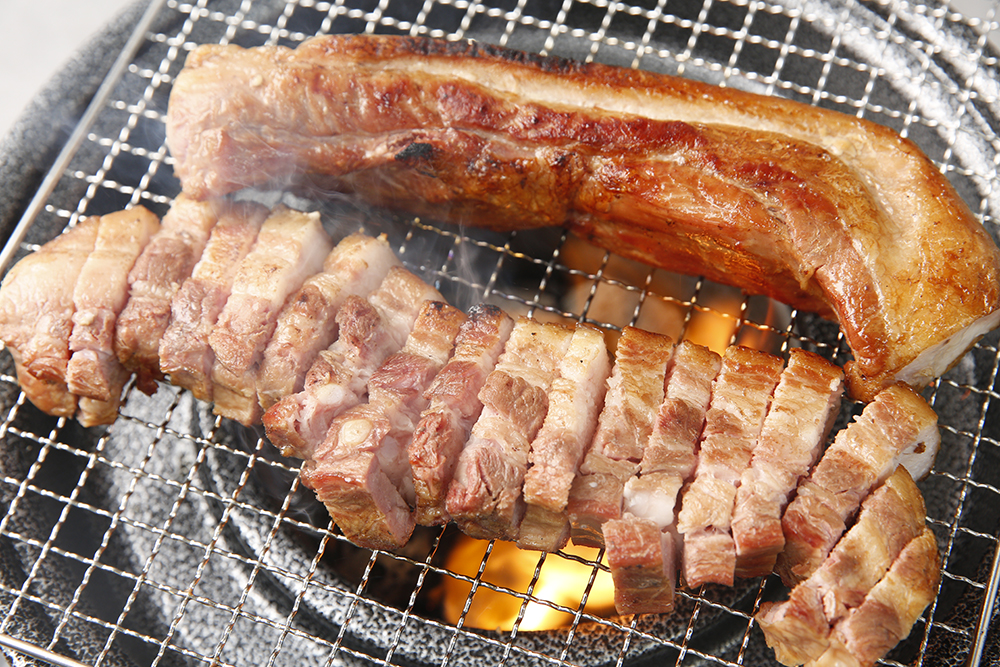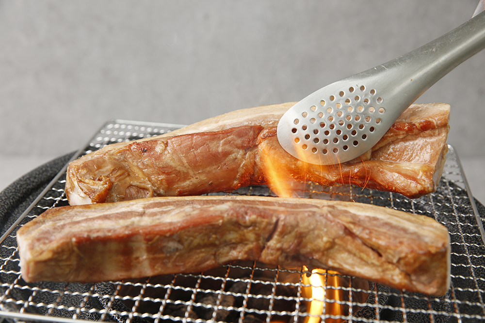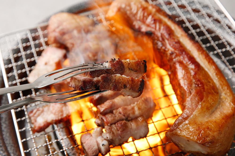 참숯으로 구워지는 통 삼겹살