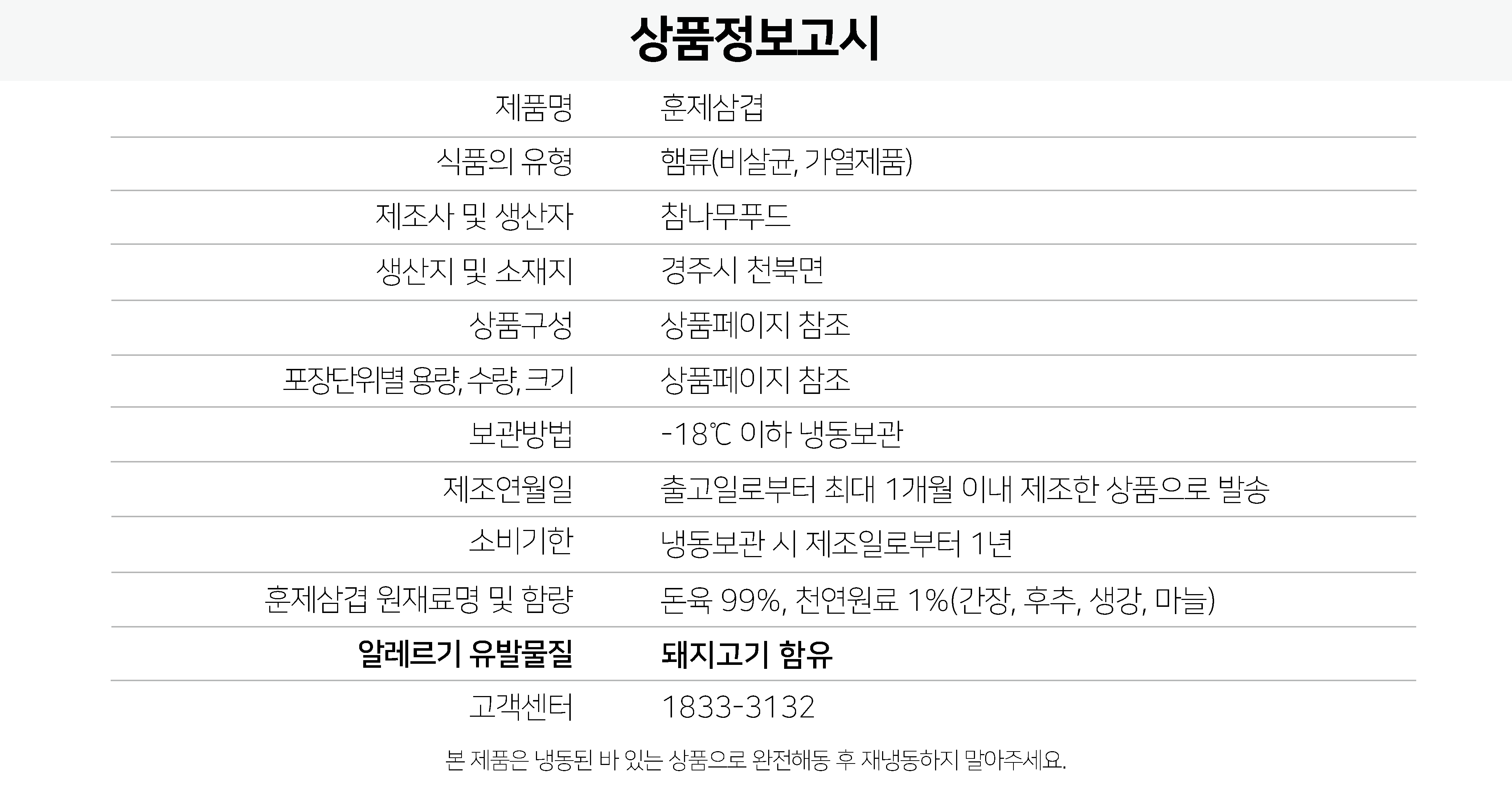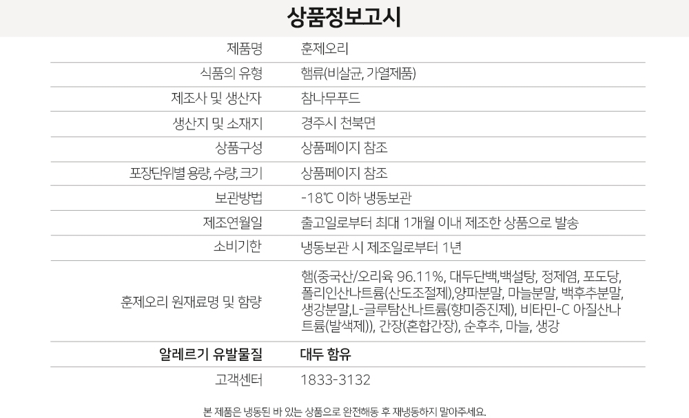 | 1-1. 제품명 | 훈제삼겹 훈제오리 |